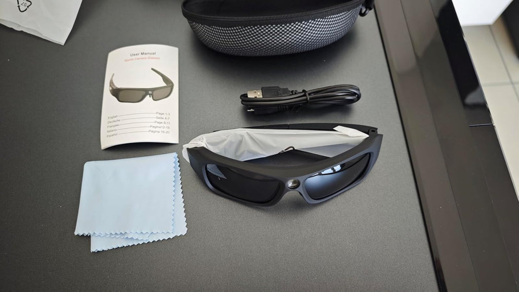 Les lunettes caméra, un câble USB, un étui, un chiffon microfibre et un manuel d’utilisation.